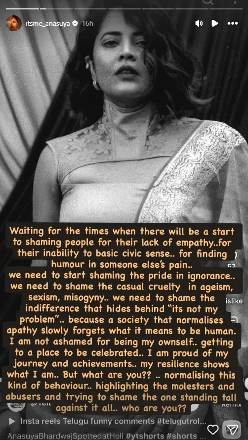 “ఇతరుల బాధలో ఆనందం వెతికే మీలాంటి వారిని చూసి సమాజం సిగ్గుపడాలి. వయసును బట్టి మహిళలపై వివక్ష చూపడం అసలు ఆమోదయోగ్యం కాదు. నేను సాధించిన విజయాలు, నా ప్రయాణం నాకు గర్వకారణం. నన్ను విమర్శించడానికి మీరెవరు?” అంటూ అనసూయ నిప్పులు చెరిగింది. గతంలో హీరో శివాజీ చేసిన కామెంట్స్‌పై కూడా అనసూయ ఇలాగే రియాక్ట్ అయ్యి పెద్ద కాంట్రవర్సీ క్రియేట్ చేసింది. అప్పట్లో ఆమె కావాలనే టార్గెట్ చేసిందని విమర్శలు వచ్చినా, ఇప్పుడు మళ్ళీ అదే రేంజ్‌లో విరుచుకుపడటంతో “అనసూయ ఈజ్ బ్యాక్” అని అంతా చర్చించుకుంటున్నారు.