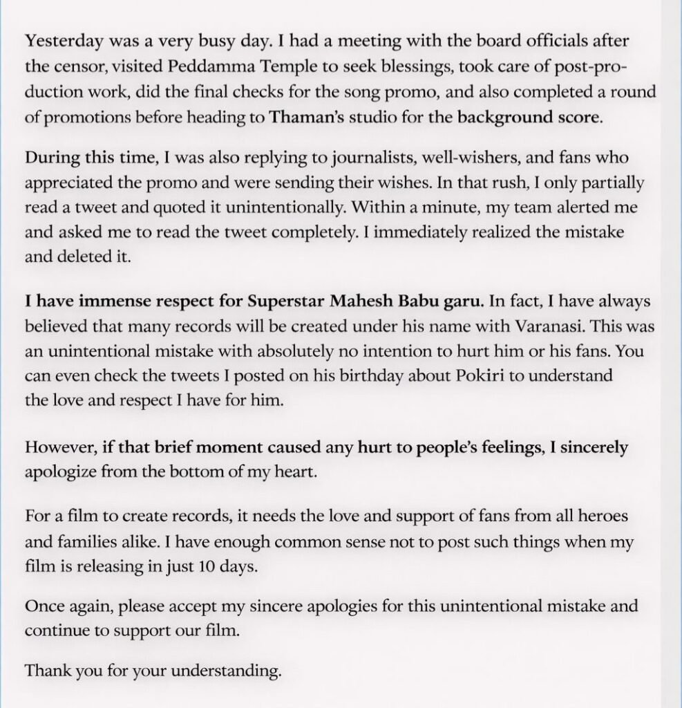 అంతేకాదు, సూపర్ స్టార్ మహేష్ బాబు అంటే తనకు ఎంతో గౌరవమని, వారణాసి లాంటి ప్రాజెక్టులతో ఆయన మరెన్నో రికార్డులు క్రియేట్ చేస్తారని తనకు నమ్మకం ఉందని హరీష్ పేర్కొన్నారు. ఎవరినీ నొప్పించడం తన ఉద్దేశం కాదని స్పష్టం చేశారు.