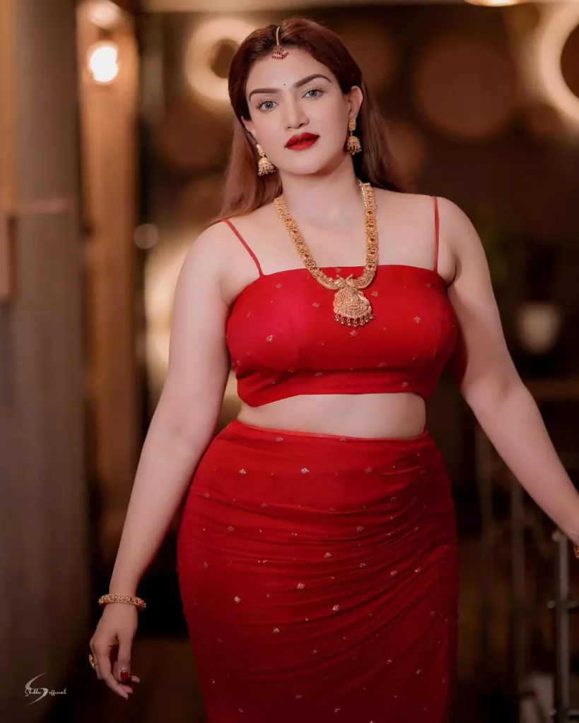 స్లీవ్లెస్ క్రాప్ బ్లౌజ్, ప్లీటెడ్ స్కర్ట్లో హనీ రోజ్ తన పర్ఫెక్ట్ బాడీ షేప్ను ప్రదర్శిస్తోంది. గ్రీన్ బ్యాక్గ్రౌండ్లో ఈ ఎరుపు రంగు మరింత ప్రకాశవంతంగా కనిపిస్తోంది.