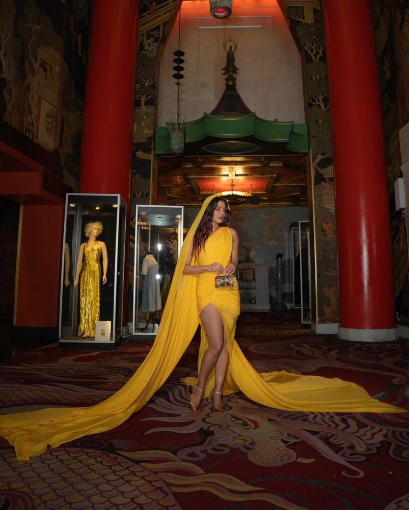 బ్రెయిట్ ఎల్లో కలర్ డ్రేప్డ్ గౌనులో ప్రియాంక మెరిసిపోతుంటే.. అది డ్రెస్సా లేక ఒంటికి చుట్టుకున్న మెరుపు తీగా అన్నట్టుగా ఉంది. ఆ బ్రైట్ కలర్ ఆమె మేని ఛాయకు తోడై చూసే కళ్లకు గ్లేర్ కొడుతోంది.