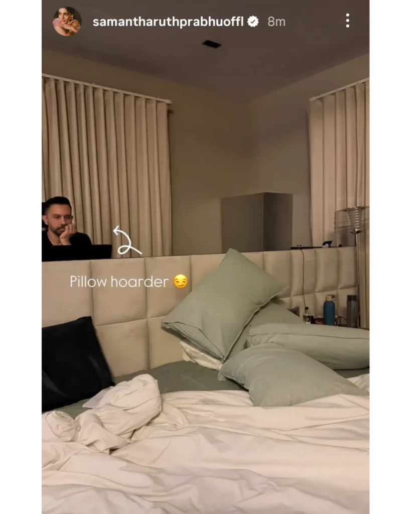 సాధారణంగా సెలబ్రిటీలు తమ పర్సనల్ లైఫ్ ని దాచాలని చూస్తారు, కానీ సమంత మాత్రం బెడ్ రూమ్ లో తన భర్త చేస్తున్న పనిని ఫోటో తీసి మరీ బయటపెట్టింది. ఆ ఫోటోలో రాజ్ నిడిమోరు బెడ్ మీద పిల్లో పట్టుకుని ఉండగా, నిద్రపోకుండా లాప్ టాప్ ముందు పెట్టుకుని చాలా సీరియస్ గా ఏదో వర్క్ చేస్తున్నాడు. దీనికి సమంత ‘పిల్లో హోర్డర్’ అని ట్యాగ్ ఇచ్చి ఒక ఫన్నీ కామెంట్ పెట్టింది.