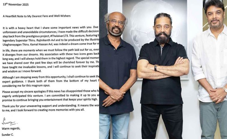 కానీ… నవంబర్ 13, 2025 తేదీతో సుందర్ సీ రాసిన లేఖ ఆ ఆనందానికి ఫుల్ స్టాప్ పెట్టింది. “అనివార్య కారణాలవల్ల తప్పుకోవాల్సి వచ్చింది” అని తెలిపారు. ఈ సినిమా తన డ్రీమ్ ప్రాజెక్ట్ అని, రజినీకాంత్–కమల్ హాసన్ లతో గడిపిన ప్రతి క్షణం ప్రత్యేకమని భావోద్వేగంగా చెప్పారు. తన మీద చూపిన నమ్మకానికి వారికి కృతజ్ఞతలు తెలిపారు.